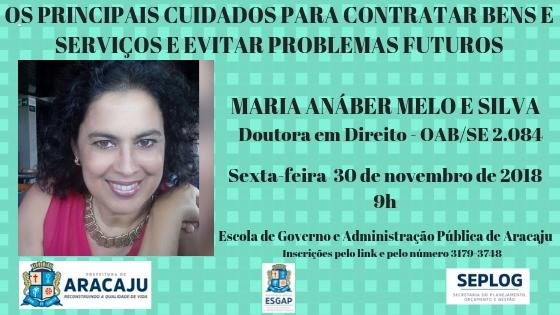 O último evento programado, de acordo com o calendário da Esgap, acontece no dia 30 deste mês e tem como tema "Os principais cuidados para contratar bens e serviços e evitar problemas futuros". A responsável por passar o conhecimento é a doutora em Direito, Maria Anáber Melo e Silva, que é especialista no assunto e atua como consultora e auditora de procedimentos pré-contratação e pós-contratação públicas.