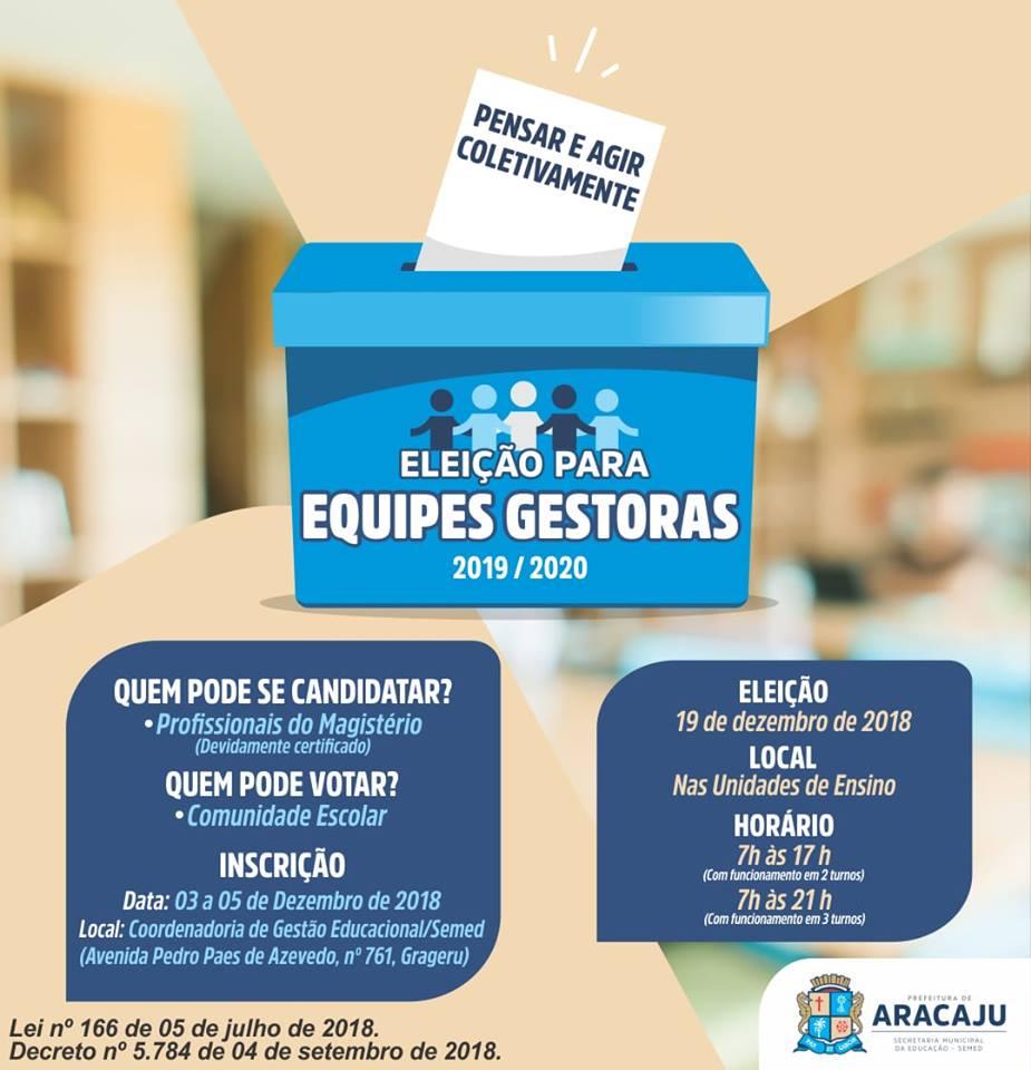A Lei da Gestão Democrática nas escolas municipais de Aracaju, a cada dia, se concretiza ainda mais. Após o processo eleitoral que elegeu os novos membros para os Conselhos Escolares, agora, a Secretaria Municipal da Educação (Semed) se prepara para a eleição dos novos gestores das unidades de ensino para o mandato de 2019 a 2020.