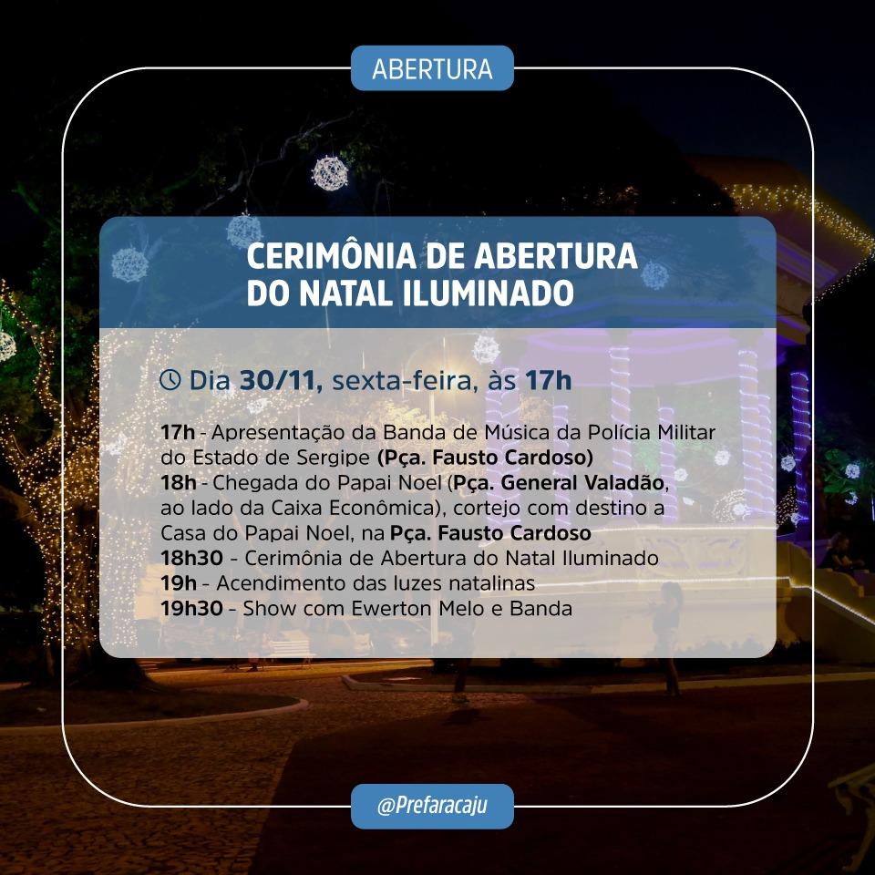 O Natal Iluminado é o resultado de uma parceria entre a Prefeitura de Aracaju e a Fecomércio, firmada no dia 5 de novembro com a assinatura do convênio. Ao todo, serão 400 mil pontos de luz para decoração da praça Fausto Cardoso e do calçadão da rua João Pessoa. O projeto prevê, ainda, a iluminação da ponte do Imperador, pórticos, tótens decorativos e uma árvore com 15 metros de altura. A programação se estende até o dia 6 de janeiro de 2019 e inclui apresentações culturais, que se iniciarão, sempre, nos fins de tarde, movimentando o centro comercial.
