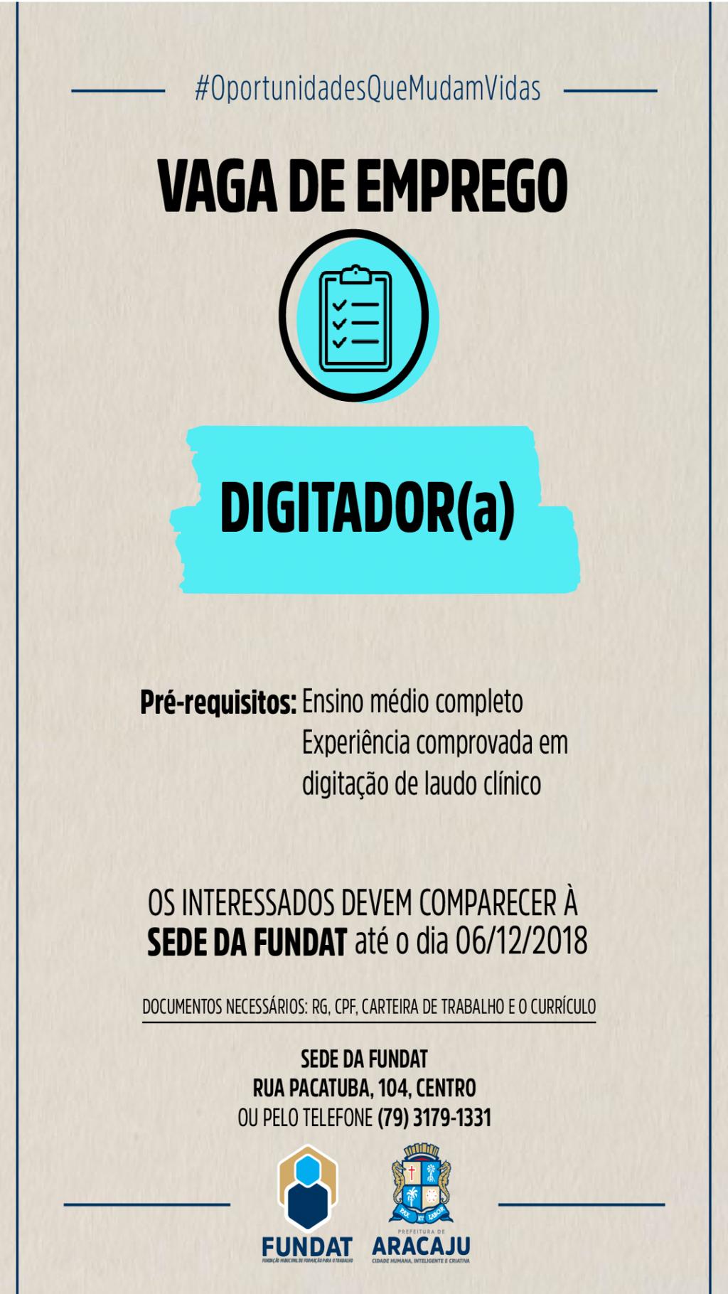 A Fundação Municipal de Formação para o Trabalho (Fundat), por meio da Agência do Trabalhador, setor responsável pelo encaminhamento de mão de obra qualificada ao mercado de trabalho, informa que está oportunidade de emprego para a função de digitador (a).