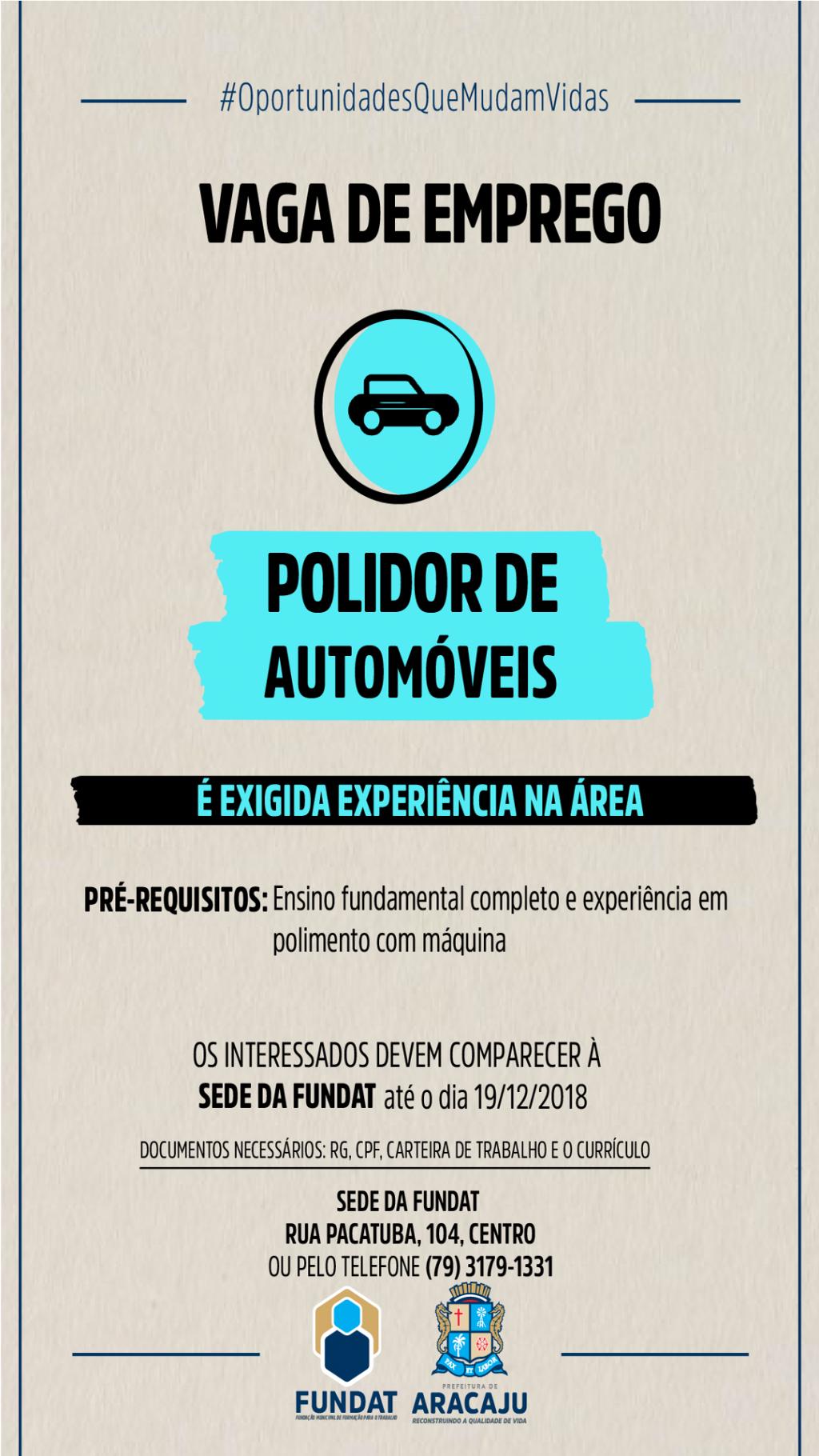 A Fundação Municipal de Formação para o Trabalho (Fundat), através da Agência do Trabalhador, setor responsável pelo encaminhamento de cidadãos ao mercado de trabalho está com oportunidade de emprego para polidor de automóveis.