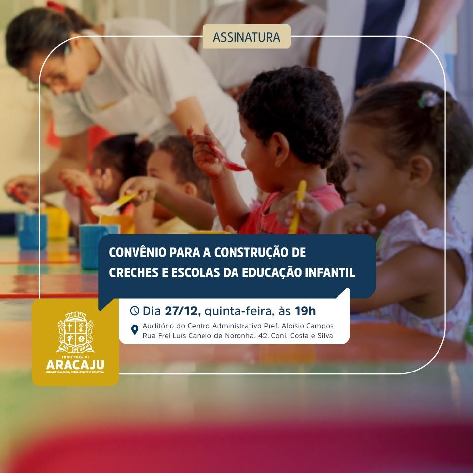 O prefeito Edvaldo Nogueira e o ministro da Educação, Rossieli Soares da Silva, convidam a todos para a solenidade de assinatura de convênios para construção de creches e escolas da educação infantil. A cerimônia será realizada no auditório do Centro Administrativo Prefeito Aloísio Campos, sede da Prefeitura de Aracaju, nesta quinta-feira, 27, às 19h.