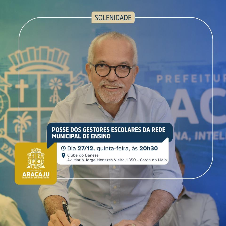 O prefeito Edvaldo Nogueira e a secretária municipal da Educação, Maria Cecília Leite, convidam a todos para a solenidade de posse dos gestores escolares da rede municipal de ensino. O evento acontecerá nesta quinta-feira, 27, às 20h30, no Clube do Banese, localizado na avenida Mario Jorge Meneses Vieira, 1350, na Coroa do Meio.