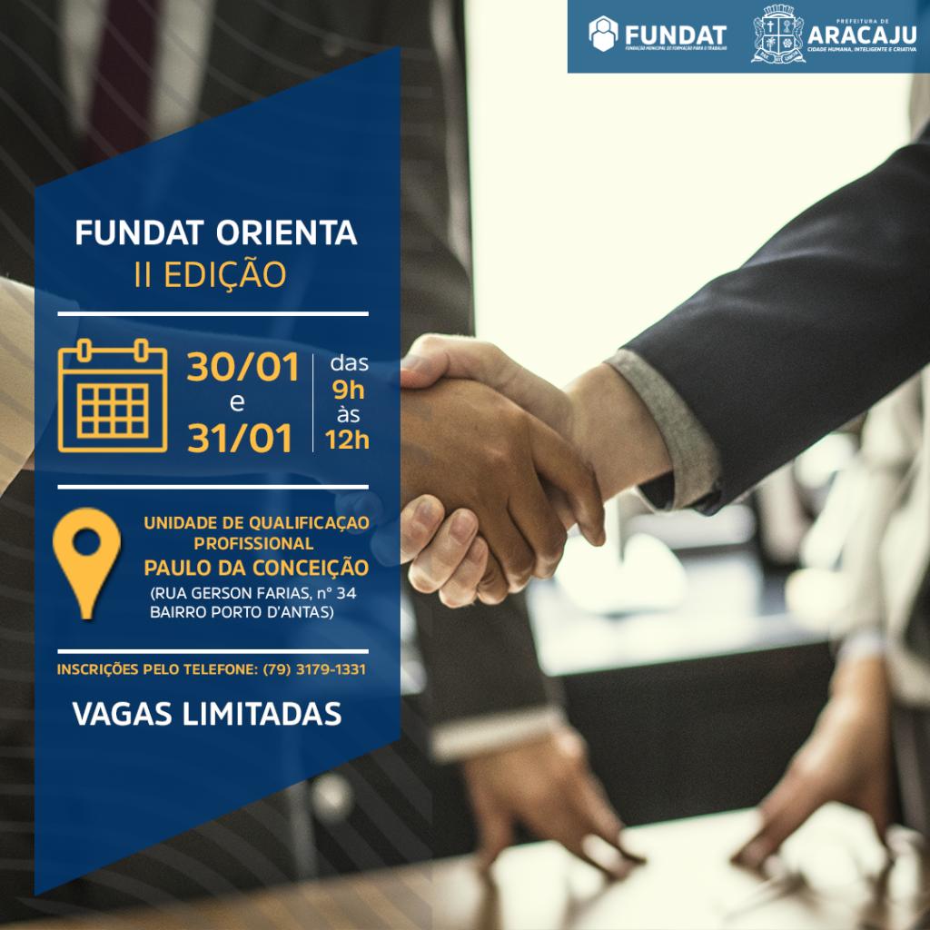 A Fundação Municipal de Formação para o Trabalho (Fundat) se preocupa não só em oferecer cursos de capacitação para a população, mas também em preparar as pessoas para um bom desempenho nas entrevistas de emprego. Exemplo disso é a realização da segunda edição da Fundat Orienta, oficina que acontecerá nos dias 30 e 31 de janeiro, das 9h às 12h, na Unidade de Qualificação Profissional (UQP) Paulo da Conceição, localizada no bairro Porto D'antas.