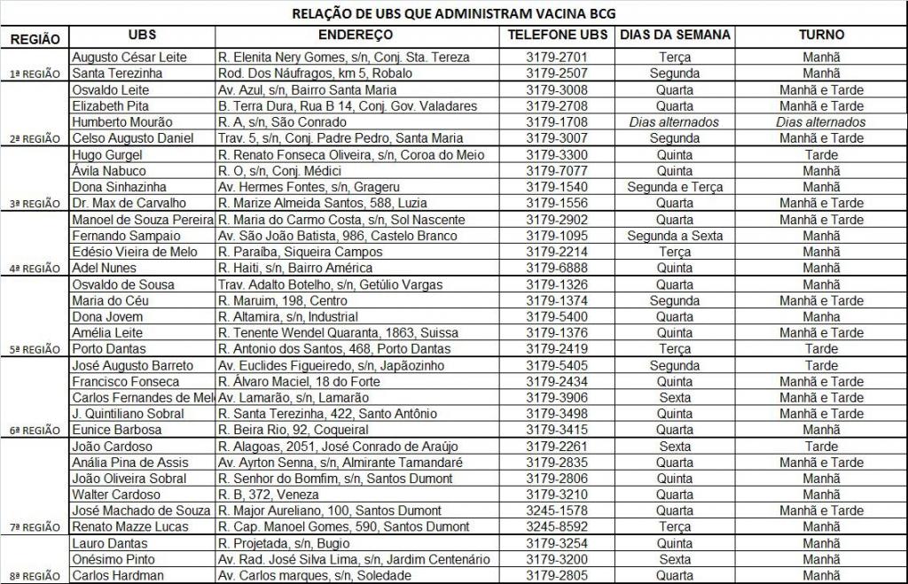 Acompanhe as UBS que administram a vacina BCG e quais os dias de aplicação de cada uma: