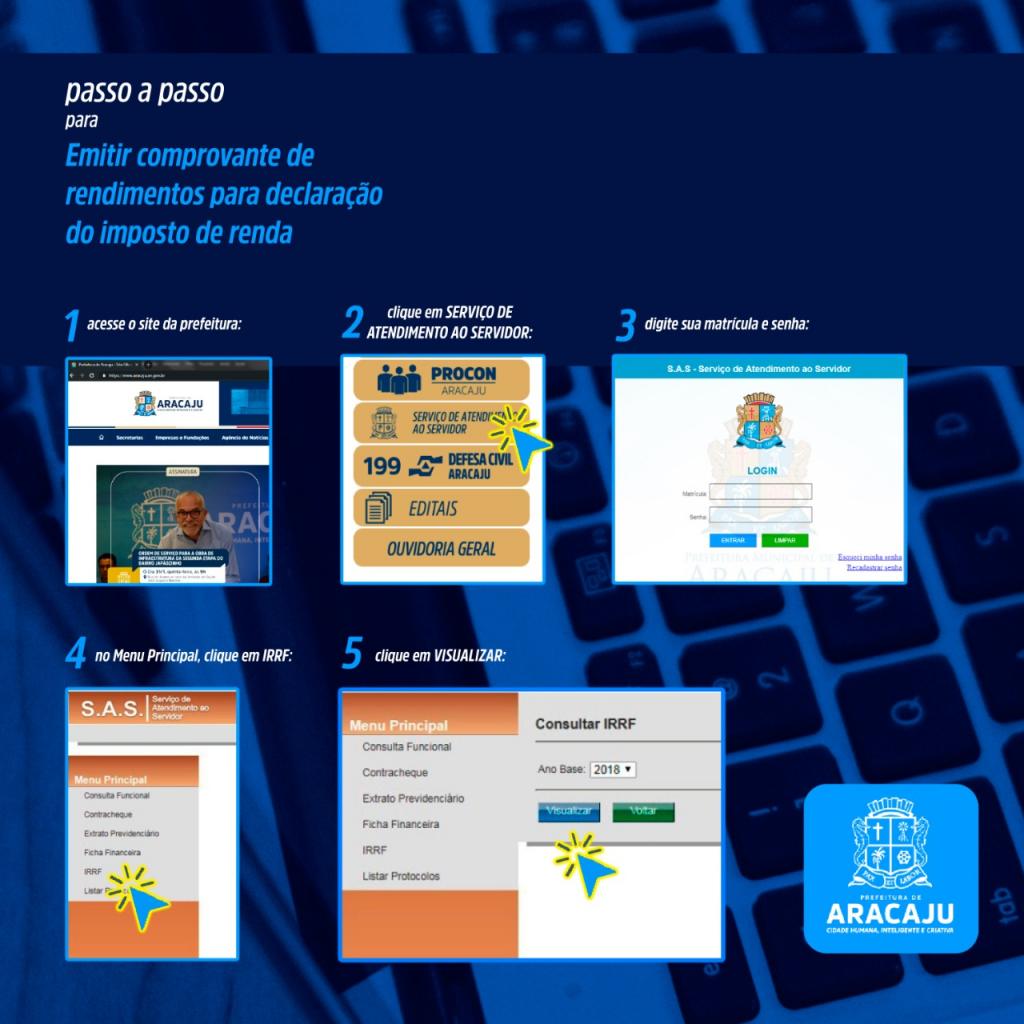 Já está disponível no site da Prefeitura de Aracaju o comprovante de rendimentos pagos e de retenção de imposto de renda na fonte, referente ao ano 2018, para fins de declaração junto à Receita Federal. Desta forma, os servidores municipais já podem acessar o site da Prefeitura e visualizar o seu comprovante.