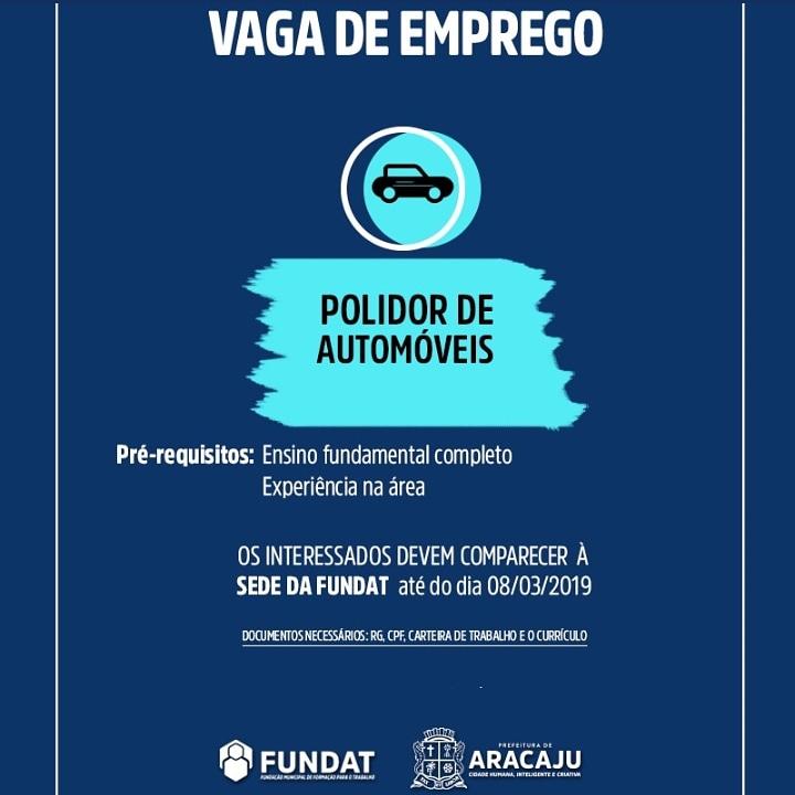 A Prefeitura Municipal de Aracaju, através da Fundação Municipal de Formação para o Trabalho (Fundat), anuncia mais uma oportunidade de emprego para os cidadãos que almejam ingressar no mercado de trabalho. Desta vez, a vaga de emprego é para a função de polidor de móveis.