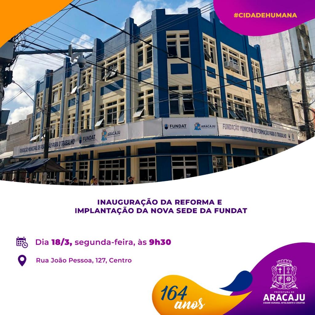 O prefeito Edvaldo Nogueira e o presidente interino da Fundação Municipal de Formação para o Trabalho (Fundat), Jorge Araújo Filho, convidam a imprensa para a inauguração da reforma e ampliação da nova sede do órgão. A solenidade acontecerá na próxima segunda-feira, 18, às 9h30, no prédio onde funcionava a antiga Delegacia Regional do Trabalho, localizado no calçadão da rua João Pessoa, nº 127, Centro.