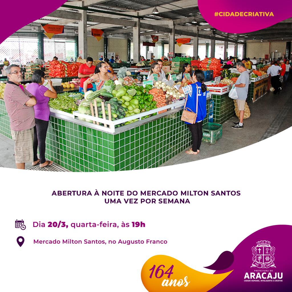 A Prefeitura de Aracaju convida a todos para o início do funcionamento do Mercado Milton Santos no período noturno uma vez por semana. A feira ocorrerá todas as quartas-feiras a partir das 19h. O mercado fica localizado na rua Promotor Joaquim Valença, no bairro Augusto Franco.