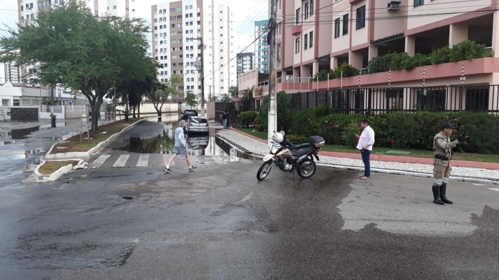 Agentes da SMTT também foram deslocados para a avenida Anísio Azevedo, no bairro São José, para fazer o bloqueio e desvio em parte da via em decorrência da maré alta que causou alagamento na localidade.