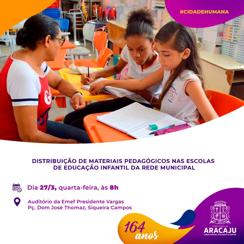 O prefeito Edvaldo Nogueira convida a todos para a distribuição de materiais pedagógicos de Educação Infantil da rede municipal. O evento será realizado nesta quarta-feira, 27, às 8h, no auditório da Escola Municipal de Ensino Fundamental (Emef) Presidente Vargas, na praça Dom Thomaz, no bairro Siqueira Campos.