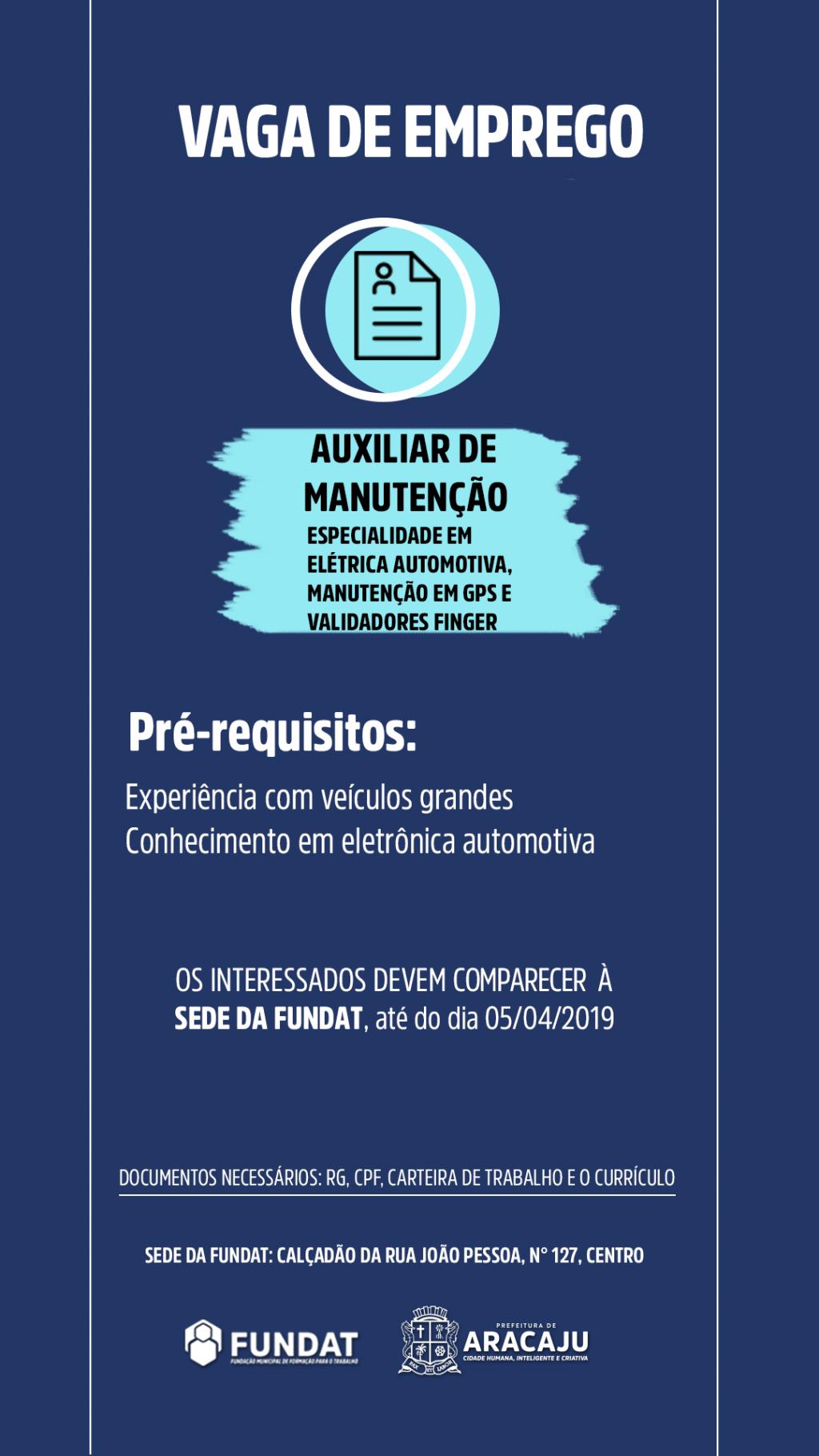 A Prefeitura de Aracaju, através da Fundação Municipal de Formação para o Trabalho (Fundat), divulga vaga de emprego para a função de auxiliar de manutenção com especialidade em elétrica automotiva, manutenção em GPS e validadores finger. Além disso, é exigido que os candidatos possuam experiência com veículos grandes.
