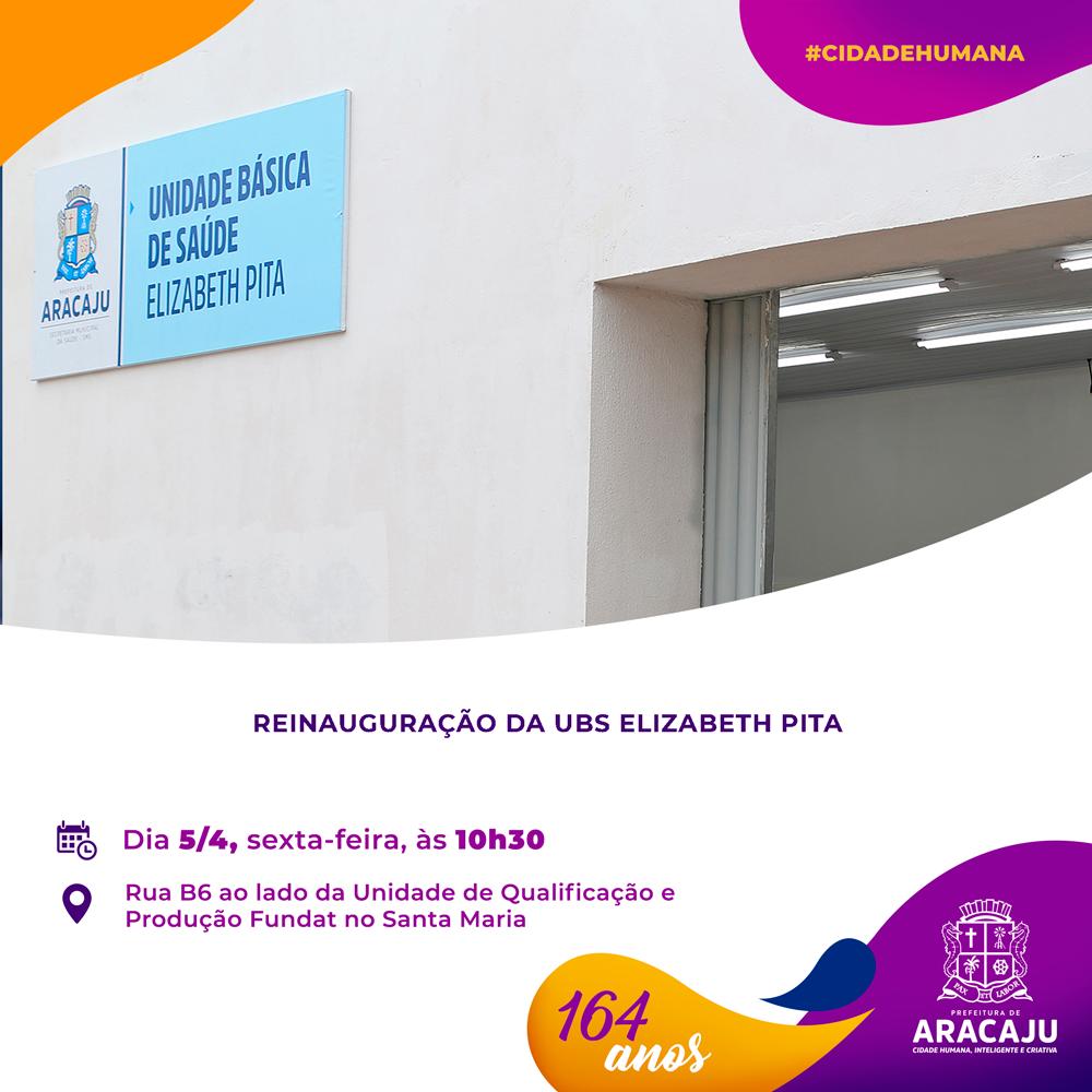 O prefeito Edvaldo Nogueira convida a todos para a reinauguração da Unidade Básica de Saúde (UBS) Elisabeth Pita. O evento, referente aos 164 anos de Aracaju, acontecerá nesta sexta-feira, 5, às 10h30, na rua B6, ao lado da Unidade de Qualificação e Produção da Fundação Municipal de Formação para o Trabalho (Fundat), no bairro Santa Maria.