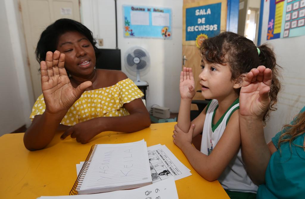 Os olhinhos atentos mostram o interesse de Yasmim Milena Silva Santos, de sete anos, pela Língua Brasileira de Sinais (Libras). Ela é aluna da Escola Municipal de Ensino Fundamental (Emef) Profª Rachel Cortês Rollemberg, localizada no bairro José Conrado de Araújo, e tem aula na Sala de Recursos da própria instituição de ensino, duas vezes por semana. Quem a acompanha nesse aprendizado é a mãe dela, a dona de casa Keila Cristina Silva Santos.