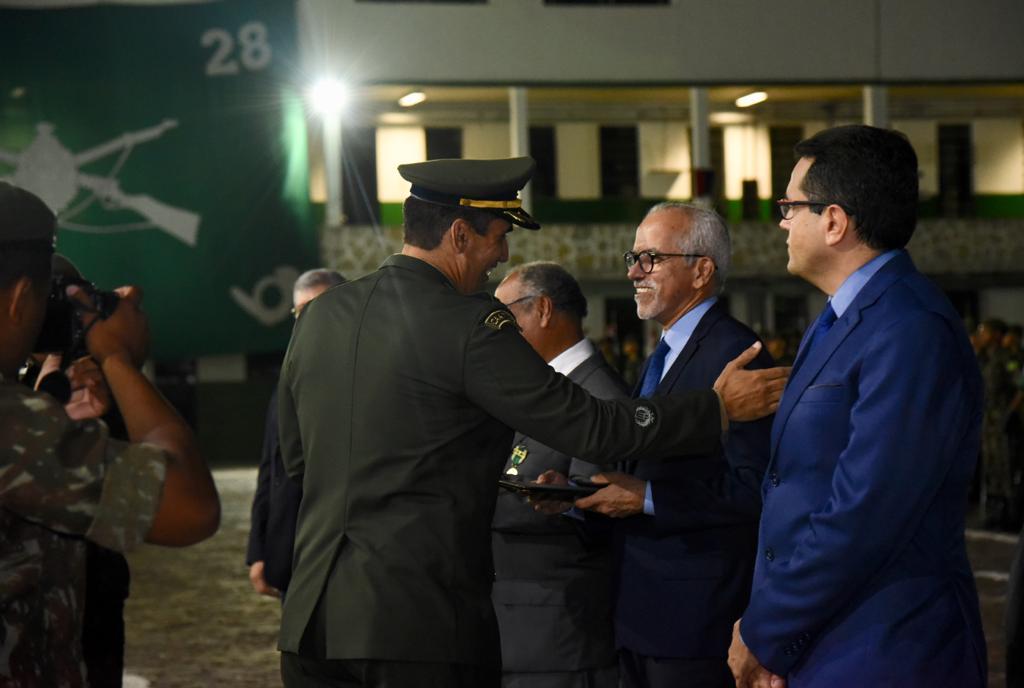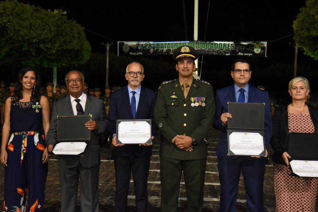 O prefeito Edvaldo Nogueira foi homenageado, na noite desta quarta-feira, 17, pelo 28° Batalhão de Caçadores. O gestor municipal recebeu o diploma "Amigo do 28 BC", que é uma honraria de reconhecimento dos relevantes serviços prestados por cidadãos ao Exército Brasileiro. Na solenidade, presidida pelo tenente coronel José Fernandes Carneiro dos Santos Filho, comandante do 28 BC, também foi realizada a formatura de novos soldados.