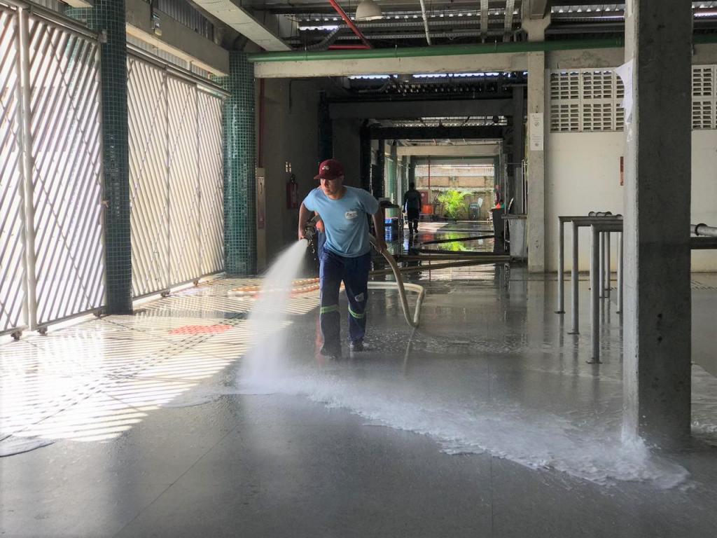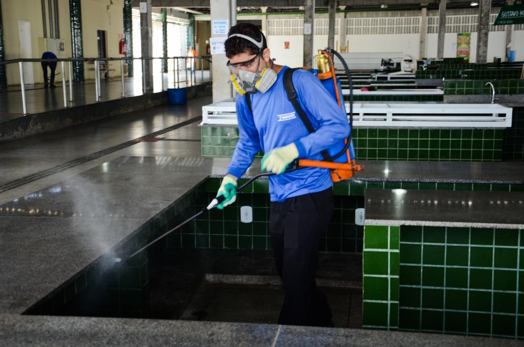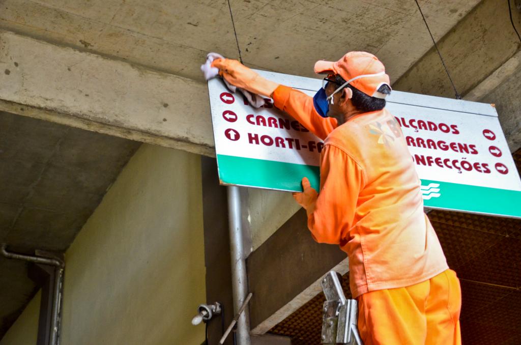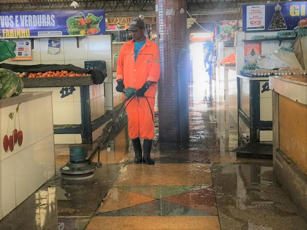 No mercado Maria Virgínia Franco, um dos principais centros de abastecimento da cidade, 33 agentes realizam, diariamente, a varrição dos corredores e lavagem dos setores de hortifruti, pescados e carnes. Já a cada 30 dias, cerca de 50 profissionais realizam uma higienização mais intensa em todos os setores com os serviços de dedetização, desratização, retirada de resíduos e desobstrução da rede interna de esgoto.