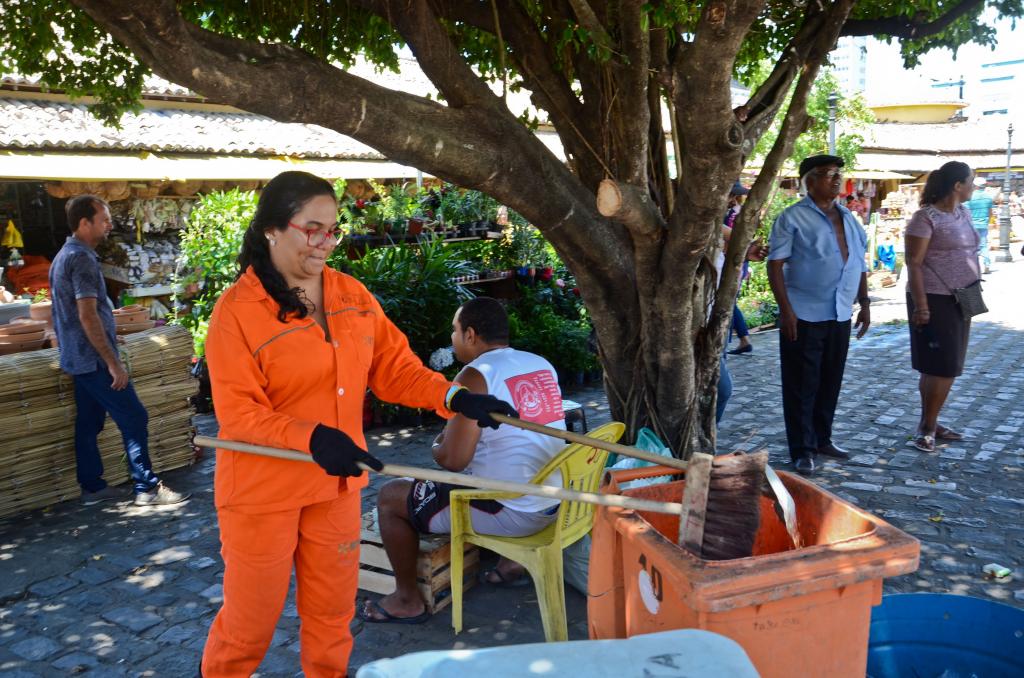 A segunda-feira também é dia de deixar a casa em ordem no mercado Vereador Milton Santos, no conjunto Augusto Franco. Por isso, para otimizar os serviços de limpeza diários, neste dia, o local é fechado para o público e 24 agentes, se revezam para tornar o ambiente mais agradável.