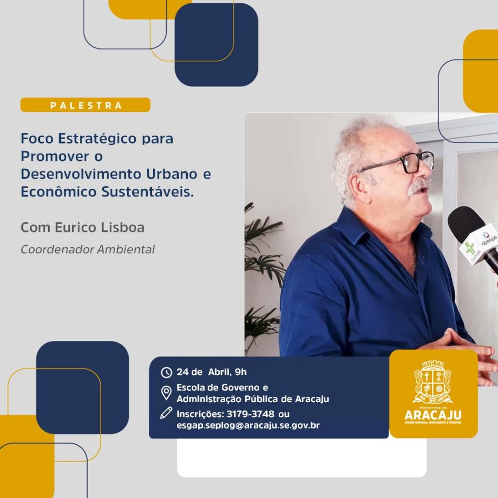 O palestrante convidado é o professor Eurico Leite Lisboa, que é formado em Administração e possui mestrado em Meio Ambiente e Desenvolvimento. Já atuou em empresas de grande porte, no setor privado, e possui vasta experiência no setor público com passagem pela Fundação Real Grandeza de Furnas, Ministério da Indústria e Comércio, e Guarda Municipal do Rio de Janeiro. Também já atuou como gestor em diversas pastas na Prefeitura de Aracaju, inclusive, na Secretaria Municipal do Meio Ambiente onde é coordenador ambiental, atualmente.