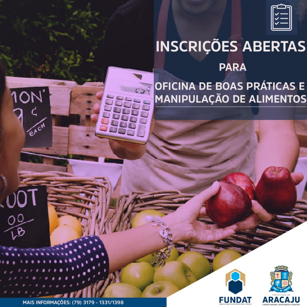 A Prefeitura de Aracaju, através da Fundação Municipal de Formação para o Trabalho (Fundat), abre inscrições para a oficina de Boas Práticas e Manipulação de Alimentos, que será realizada nesta terça-feira, 30, das 8h às 17h, no auditório do Estação Cidadania, localizado na rua Pacatuba, 61, Centro. As inscrições acontecem até esta segunda-feira, 29, até às 17h.