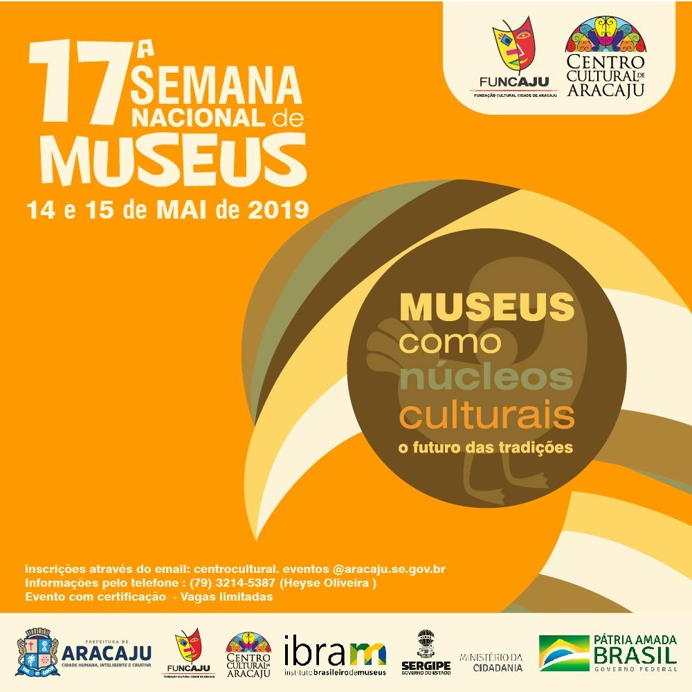 A Prefeitura de Aracaju, através da Fundação Cultural Cidade de Aracaju (Funcaju), está recebendo a 17ª Semana Nacional de Museus, nos dias 14 e 15 de maio, das 9h às 12h. O evento, realizado pelo Instituto Brasileiro de Museus (Ibram), acontece no Museu Cidade de Aracaju Prefeito Viana de Assis, localizado no Centro Cultural de Aracaju, com a temática ‘Museus como núcleos culturais: O futuro das tradições’.