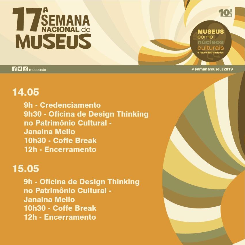 A programação da 17ª Semana Nacional de Museus inicia nesta terça e se repete na quarta, às 9h30, com a oficina “Design Thinking no Patrimônio Cultural”, ministrada por Jaqueline Mello. Em seguida, às 10h30, estará disponível um Coffee Break, e às 12h, o encerramento.