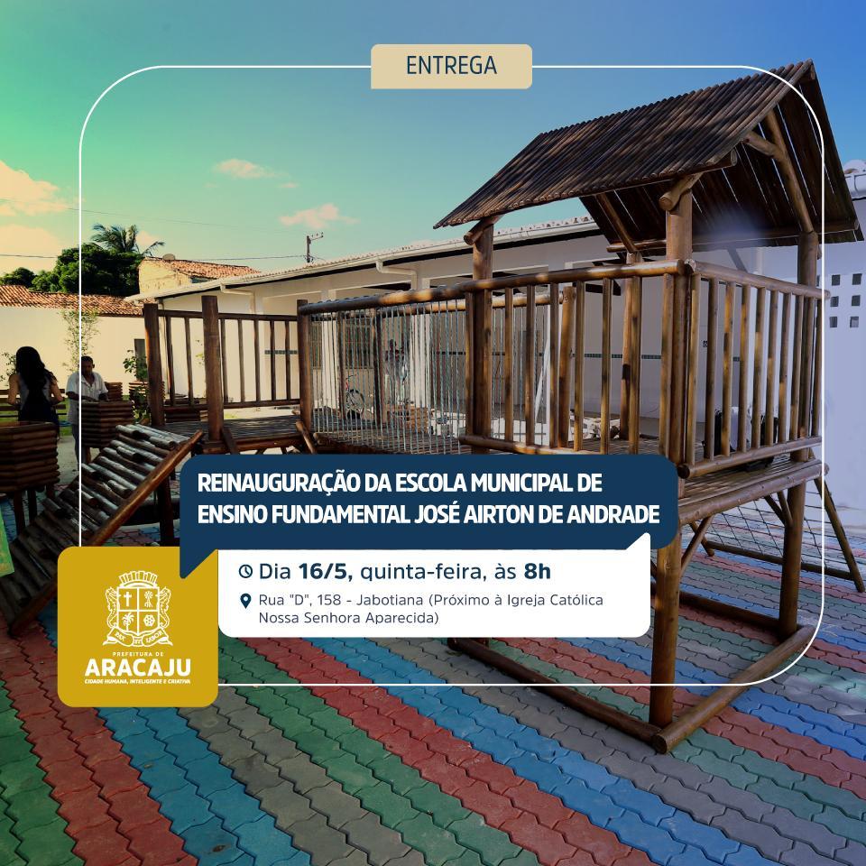 O prefeito Edvaldo Nogueira e a secretária municipal da Educação, Maria Cecília Tavares Leite, convidam a todos para a reinauguração da Escola Municipal de Ensino Fundamental (Emef) José Airton Andrade, solenidade que ocorrerá nesta quinta-feira, às 8h, na unidade de ensino, localizada na rua “D”, número 158, no bairro Jabotiana.