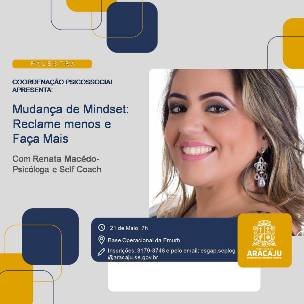 A primeira palestra, cujo tema é "Mudança de Mindset: reclame menos e faça mais", é destinada aos servidores da Base Operacional da Empresa Municipal de Urbanização (Emurb) e será realizada no dia 21, às 7h. Para ministrar sobre o assunto, a Esgap conta com a psicóloga e self coach, Renata Macêdo.