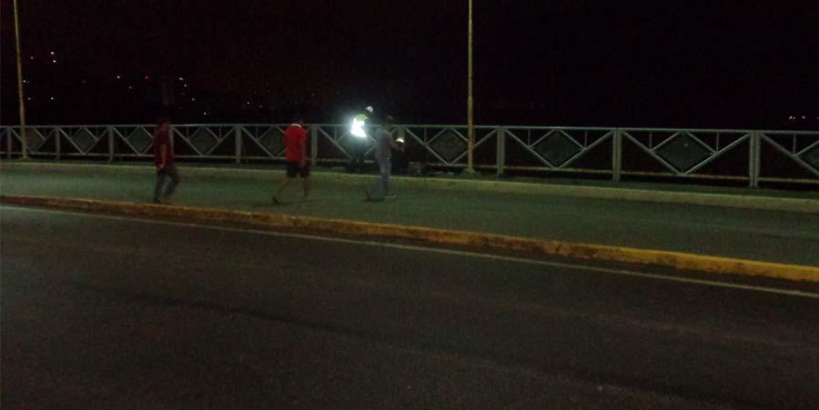 Os testes começaram por volta das 23h desta quinta-feira, 16, e se prolongaram até as primeiras horas desta, 17, com profissionais se deslocando com seus equipamentos ao longo do vão da ponte.