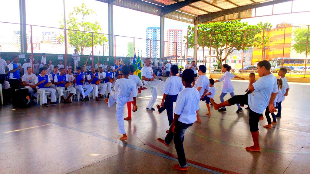 A Emef Maria da Glória Macedo, no bairro Industrial, desenvolve, há dois anos, um projeto que oferece aulas de capoeira para os estudantes. Atualmente, cerca de 40 alunos e ex-alunos da escola estão inscritos e, segundo a diretora da unidade, a iniciativa contribui de forma direta em diversos aspectos. “O mestre trabalha muito a questão da disciplina, e isso reflete nas atividades pedagógicas do dia a dia. Além de ser uma prática que trabalha a lateralidade, o equilíbrio, o corpo. Eles adoram praticar e estão muito felizes em poder participar deste festival”, conta a diretora Gleice Mafra.