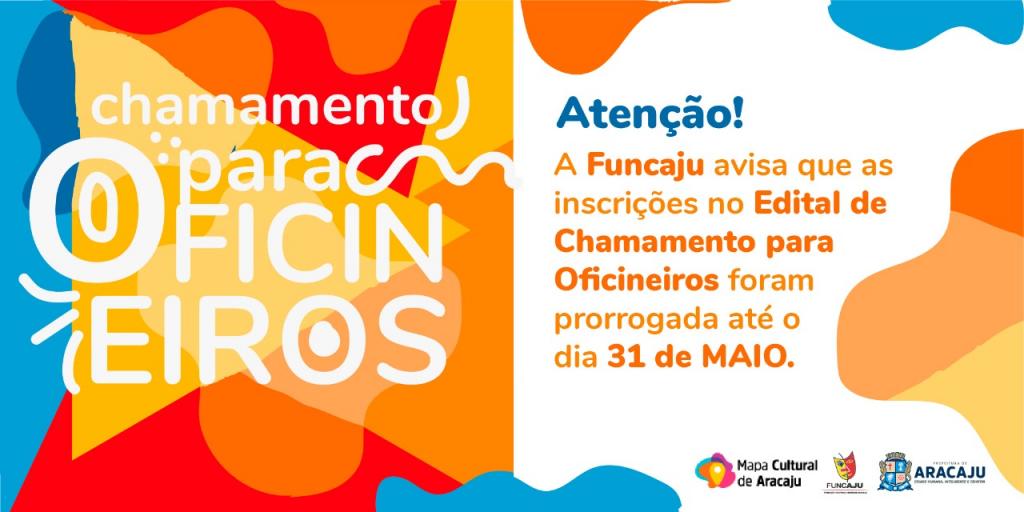 O edital para o ‘Chamamento para Credenciamento de Interessados na Prestação de Serviços de Desenvolvimento de Oficinas Livres’, lançado pela Prefeitura de Aracaju, através da Fundação Cultural Cidade de Aracaju (Funcaju), que encerraria no dia 17, foi prorrogado para o dia 31 de maio. Os profissionais interessados em apresentar seus projetos culturais para o município devem se inscrever preenchendo um formulário no Mapa Cultural de Aracaju .