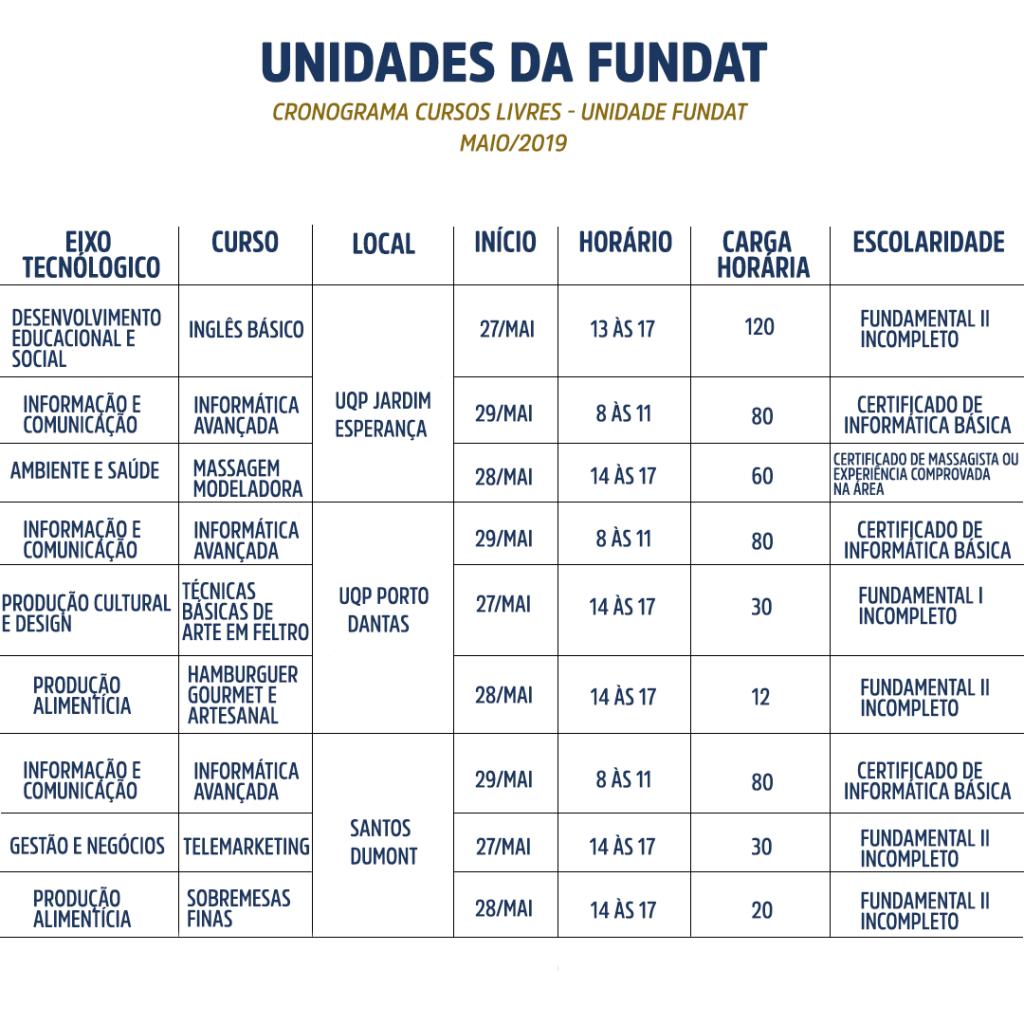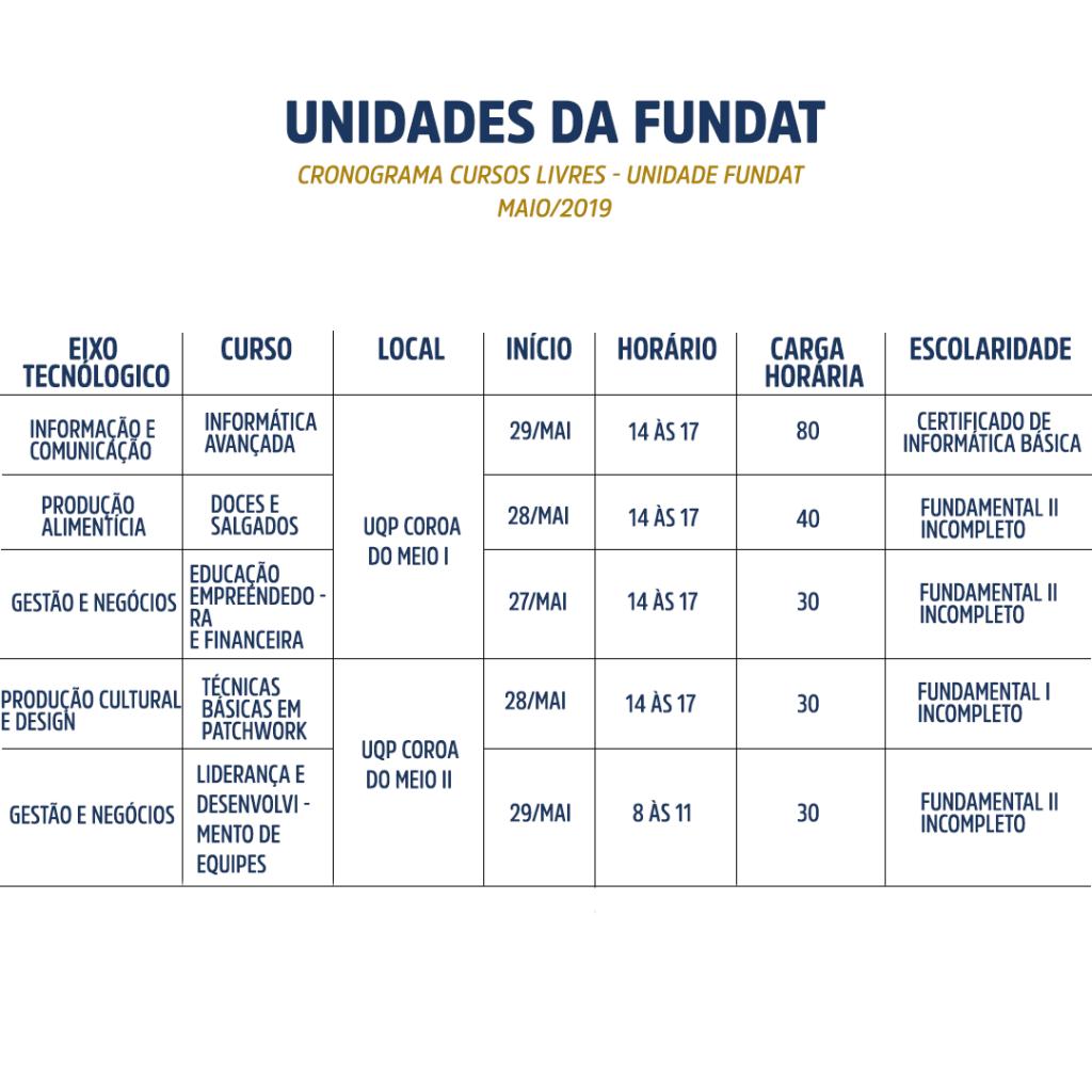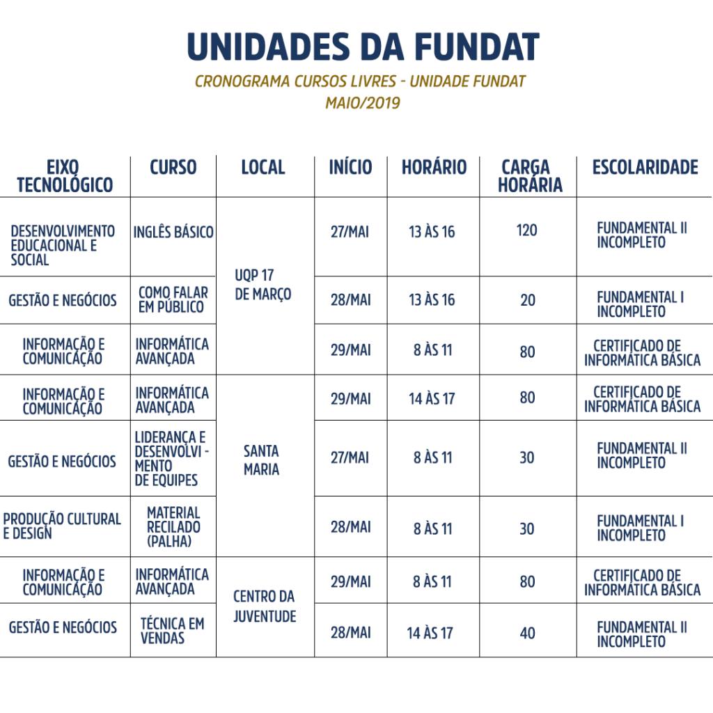 As capacitações são gratuitas e a matrícula pode ser feita de segunda a sexta, das 7h30 às 12h e das 13h às 17h, na sede da Fundat, localizada no calçadão da rua João Pessoa, 127, Centro, ou diretamente na Unidade de Qualificação Profissional (UQP) onde ocorrerá o curso. Porém, as inscrições para as turmas que acontecerão nas unidades dos bairros 17 de Março e Santa Maria serão realizadas apenas nos respectivos locais. Mas, o horário de funcionamento da unidade do bairro 17 de Março é das 8h às 16h. Além disso, as matrículas para os cursos do eixo Informação e Comunicação só poderão ser efetuadas no local em que ocorrerão as aulas. É importante ressaltar que as inscrições são realizadas enquanto houver vagas e que a maior parte delas são destinadas às UQPs.