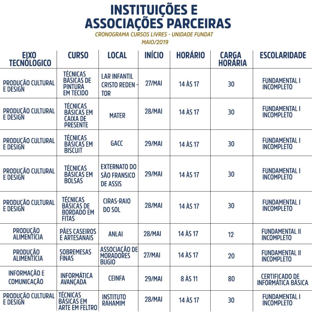 Sobremesas Finas: Carga Horária: 20h |Início: 27/05| Horário: 14h às 17h | Requisito mínimo de escolaridade: Ensino Fundamental II (6º ao 9º ano) Incompleto | Local de realização: Associação de Moradores do Bugio (Av. Centenário, s/n, bairro Bugio);