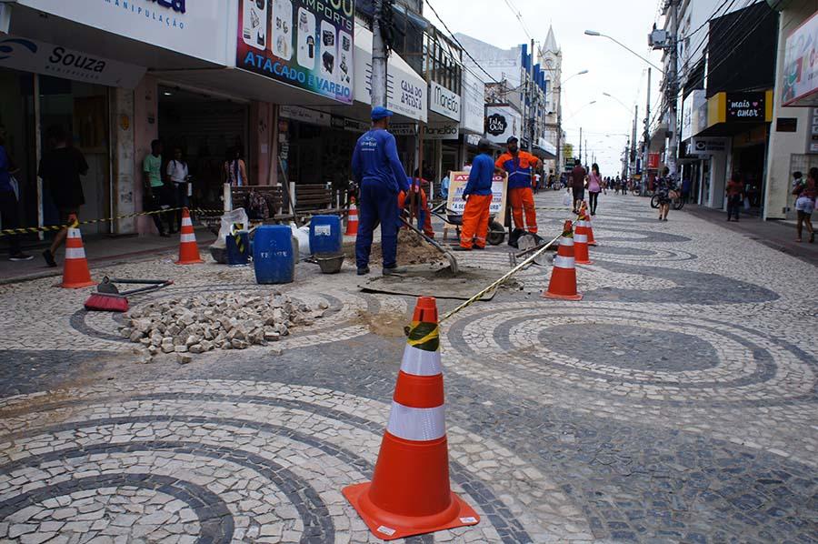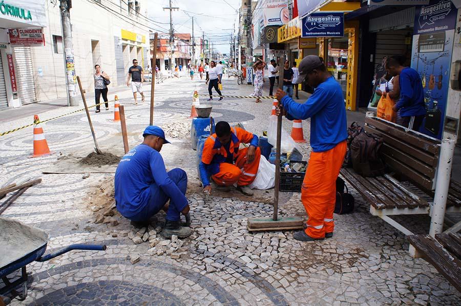 Diante dos desgastes provocados pelas oscilações do clima e, em alguns casos, pela depredação, muitos pontos da área dos calçadões necessitam de manutenção e de reparos. O trabalho realizado nos últimos dias tem recuperado os trechos danificados do pavimentos composto de pedras, melhorando os aspectos e deixando ainda mais belo um dos cartões postais da cidade e que atrai muitos frequentadores.