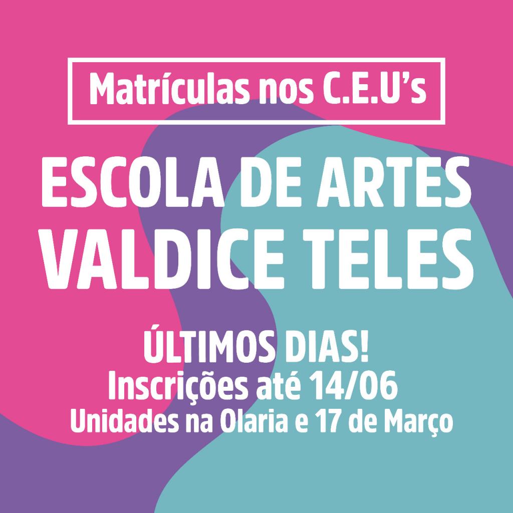 O prazo para se matricular nos diversos cursos ofertados pela Escola de Artes Valdice Teles nos CEU’s dos bairros 17 de Março e Olaria termina nesta sexta-feira, 14. A iniciativa é uma realização da Prefeitura Municipal de Aracaju, através da Fundação Cultural Cidade de Aracaju (Funcaju).