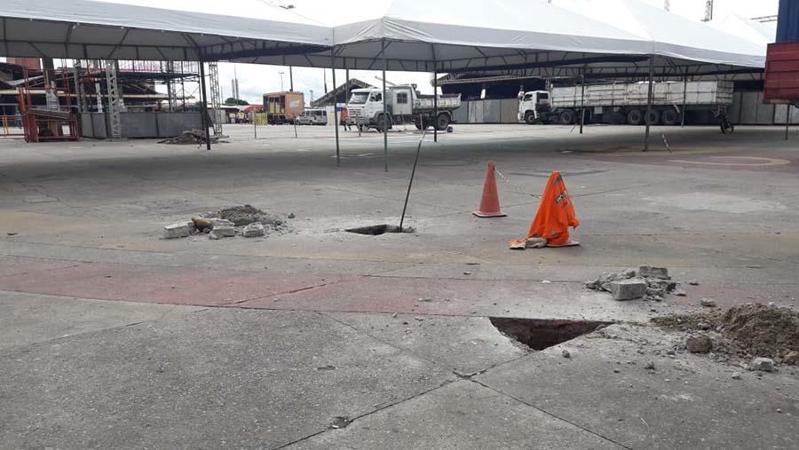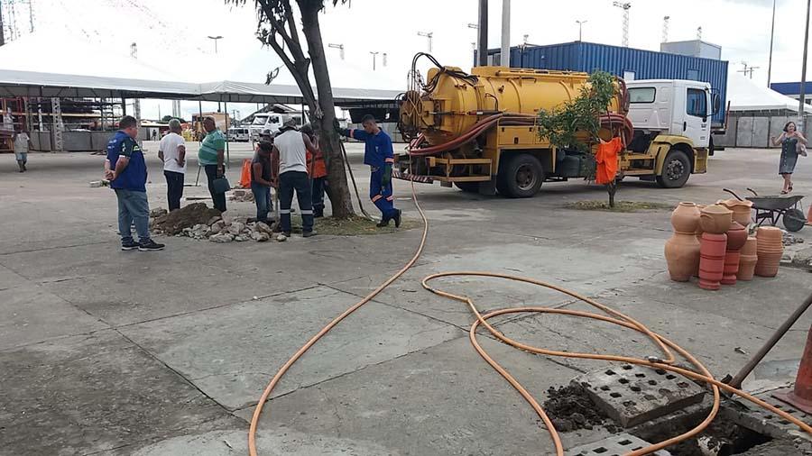 Um caminhão de sucção está sendo utilizado para limpar a rede de drenagem do local, a fim de garantir maior vazão e, caso chova no momento dos shows, não haja retenção de água.
