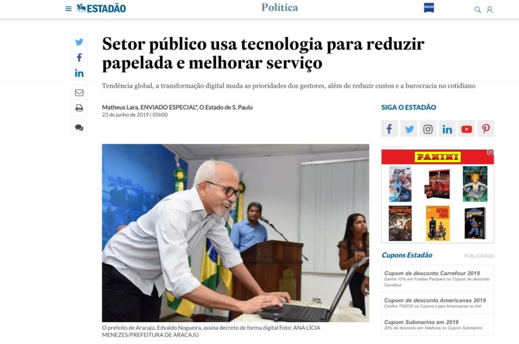 O jornal Estadão destacou em reportagem veiculada no último domingo, 23, a Prefeitura de Aracaju como exemplo de uso correto dos avanços tecnológicos. Intitulado de “Setor público usa tecnologia para reduzir papelada e melhorar serviço”, o texto aponta o AjuInteligente como marco para a transformação digital como forma de atender aos cidadãos.