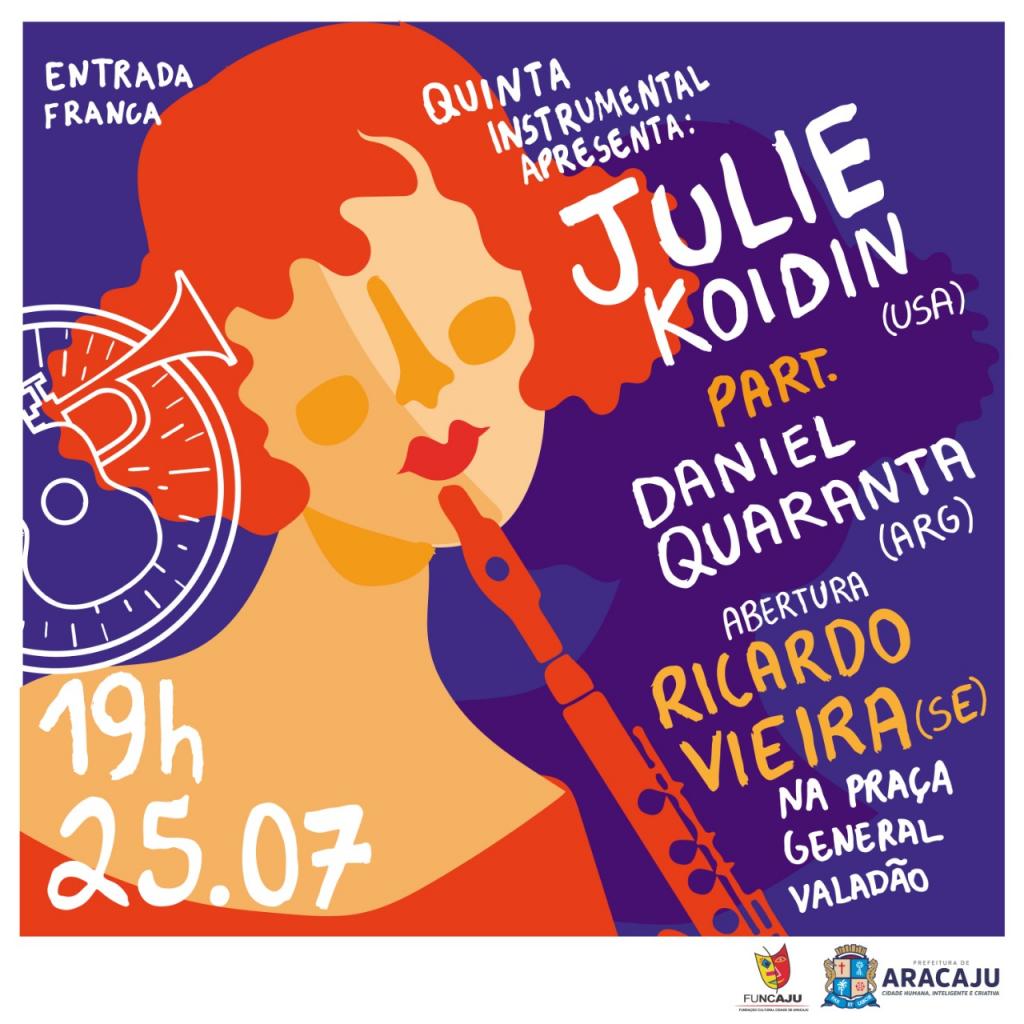 Realização da Prefeitura de Aracaju, o projeto Quinta Instrumental inicia a agenda do segundo semestre no próximo dia 25, na praça General Valadão, com shows da flautista americana Julie Koidin e do violonista sergipano Ricardo Vieira.