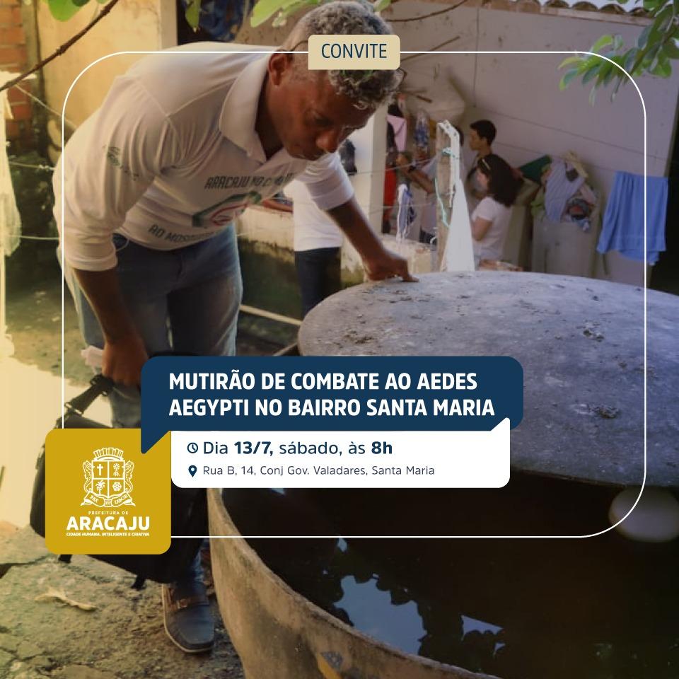 A Prefeitura de Aracaju realiza, neste sábado, dia 13, no bairro Santa Maria, na zona Sul da capital, o segundo mutirão de combate ao Aedes aegypti, no âmbito do Plano de Intensificação das Ações de Combate ao mosquito.