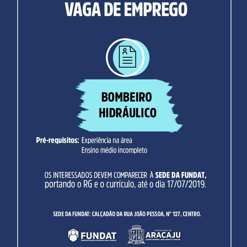 A Prefeitura de Aracaju, por intermédio da Fundação Municipal de Formação para o Trabalho (Fundat), anuncia a oferta de emprego para bombeiro hidráulico. Os interessados em participar da seleção para a oportunidade de emprego devem médio incompleto e experiência na área.