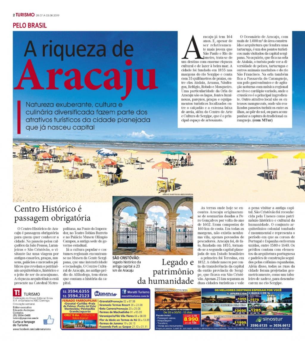 O Destino Aracaju é mais uma vez divulgado na região Sul do país. Baseado em Novo Hamburgo, na Região Metropolitana de Porto Alegre, no Rio Grande do Sul, o Jornal Novo Hamburgo divulgou, nesta semana, ampla reportagem em que destaca a história, infraestrutura turística, praias e equipamentos culturais que o visitante pode usufruir na capital sergipana.