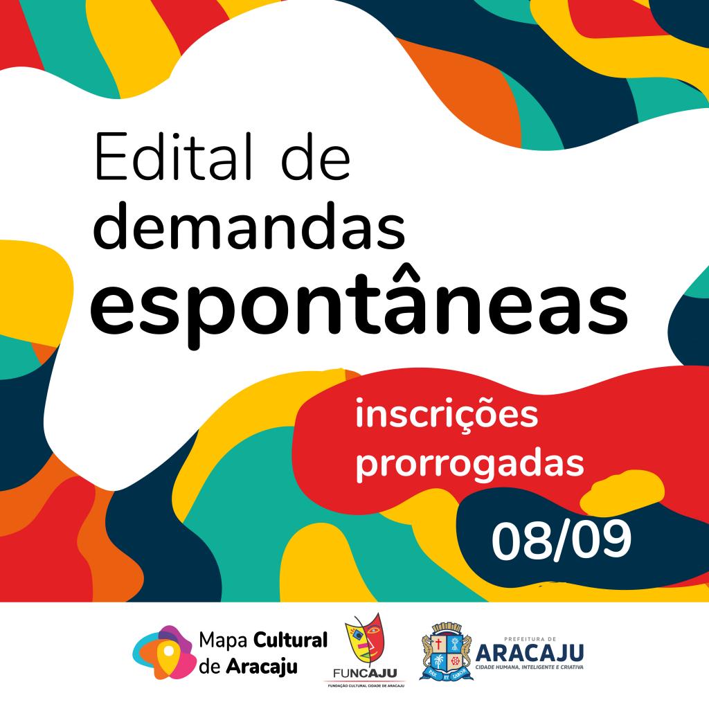 As inscrições para o Edital de Apoio a Projetos Culturais de Demandas Espontâneas foram prorrogadas para o dia 8 de setembro. O objetivo deste chamamento público, realizado pela Prefeitura de Aracaju, por meio da Fundação Cultural Cidade de Aracaju (Funcaju), é selecionar projetos com iniciativas culturais propostas por pessoas, grupos, coletivos ou associações da sociedade civil.