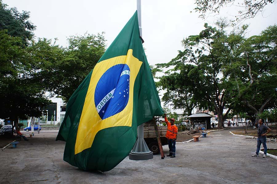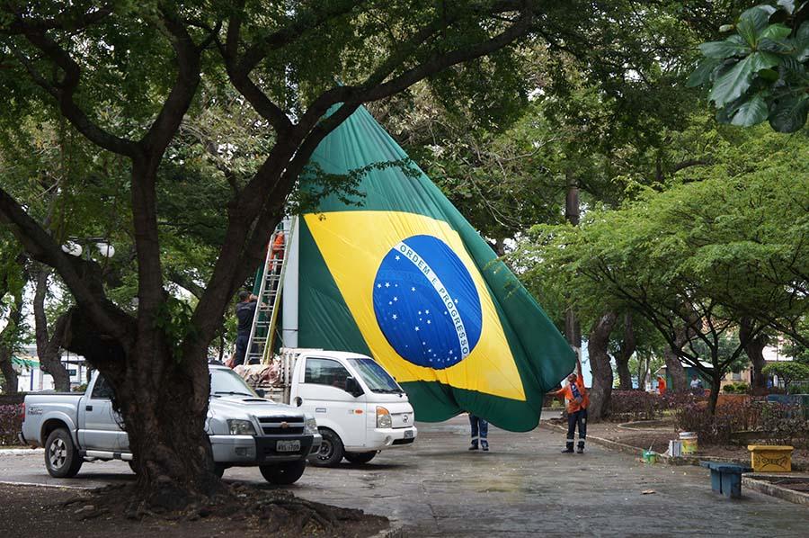 O serviço foi iniciado na última quarta-feira, dia 14, com a retirada do material corroído, recomposição da base de cimento do mastro, pintura e, na sexta-feira, 16, foi concluído com o hasteamento de uma nova flâmula medido 6m x 4,5m.