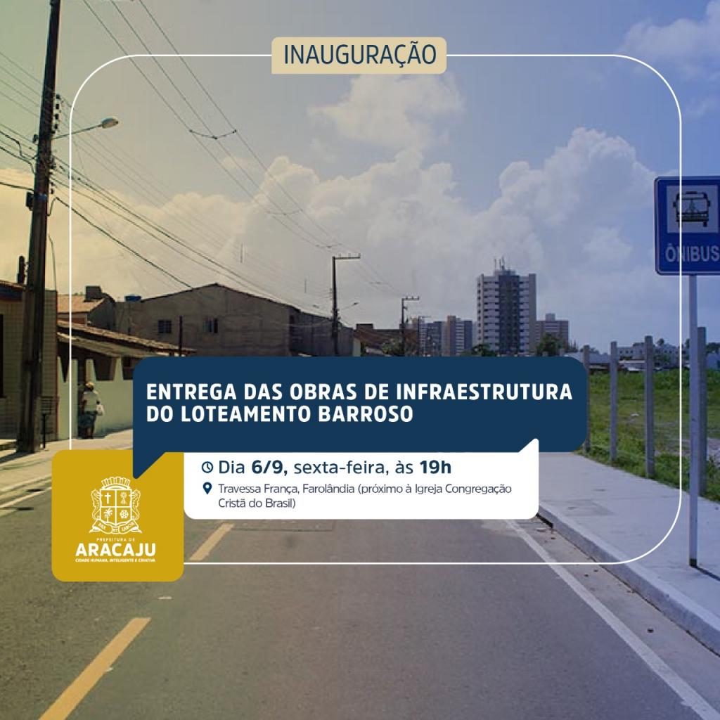 O prefeito Edvaldo Nogueira convida toda a população aracajuana para a entrega da segunda etapa das obras de infraestrutura do Loteamento Barroso, no bairro Farolândia, nesta sexta-feira, dia 6, às 19h, na travessa França (próximo à Igreja Congregação Cristã do Brasil).