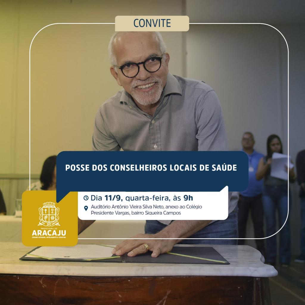 O prefeito Edvaldo Nogueira e a secretária municipal da Saúde, Waneska Barboza, convidam a população aracajuana para a posse dos 720 conselheiros locais de Saúde, eleitos durante as conferências locais realizadas em fevereiro deste ano. Os novos conselheiros serão empossados nesta quarta-feira, dia 11, às 9h, no auditório Antônio Vieira Silva Neto, anexo ao Colégio Presidente Vargas, no bairro Siqueira Campos.