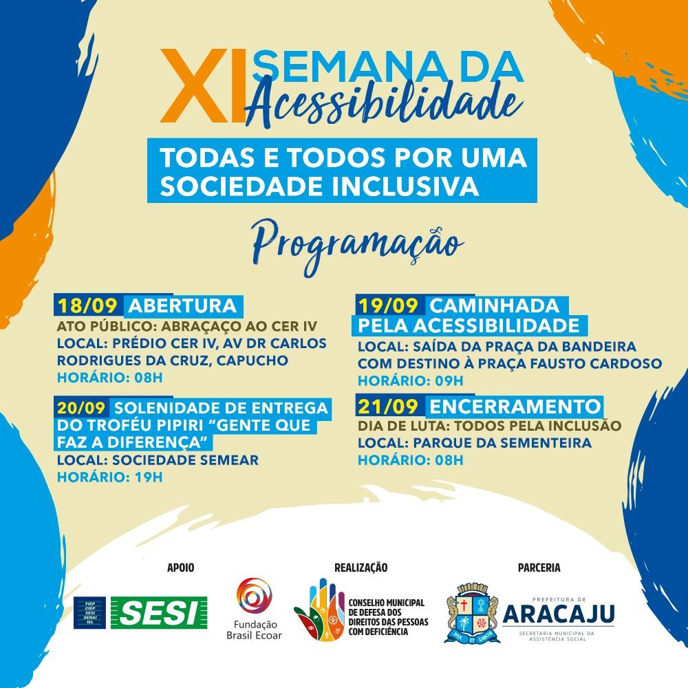 Durante esses quatro dias, na capital sergipana, diversas ações de sensibilização serão realizadas, como a 9ª edição do Troféu Pipiri, um conjunto de iniciativas que visam à garantia do acesso e participação de pessoas com deficiência ou mobilidade reduzida nos espaços públicos e privados, com autonomia e inclusão social no município de Aracaju. O evento conta com o apoio do Serviço Social da Indústria (SESI) e Fundação Brasil Ecoar.