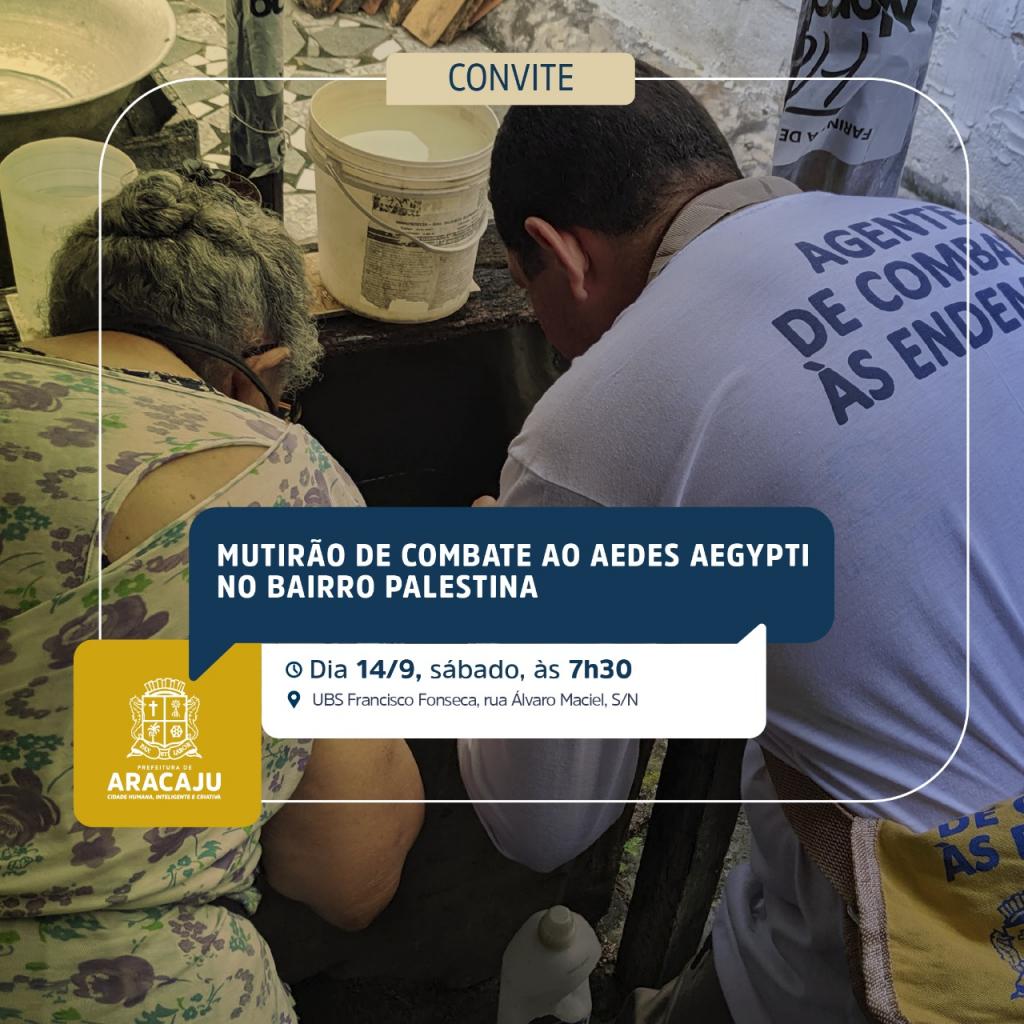 Com envolvimento de diversas secretarias e órgãos municipais, a Prefeitura de Aracaju realiza, na manhã deste sábado, dia 14, mais um mutirão do Plano de Intensificação das Ações de Combate ao mosquito Aedes Aegypti. A ação será desenvolvida no bairro Palestina, zona norte da capital, e atividades serão iniciadas às 7h30, a partir da Unidade Básica de Saúde (UBS) Francisco Fonseca, localizada na rua Álvaro Maciel, s/n.