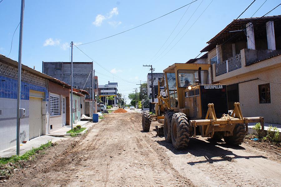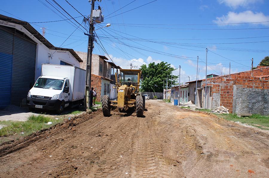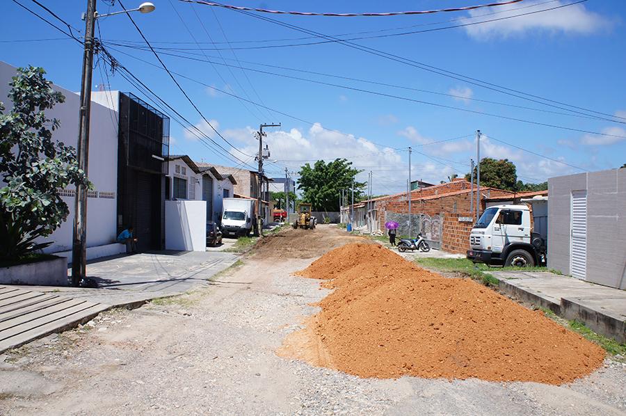 Para a execução do serviço, a via recebe resíduos à base de barro e areia, mais consistente para estabilizar a base primária e, em seguida, uma retroescavadeira espalha o material em toda a extensão da rua, nivelando e possibilitando mais aderência para tráfego de veículos.