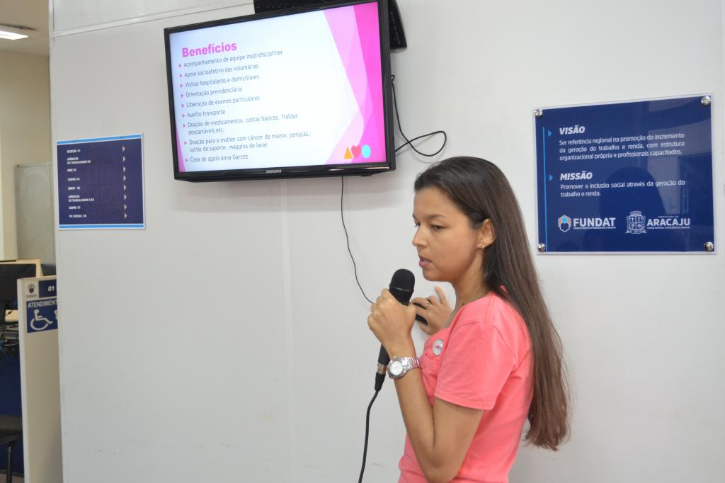 Na manhã desta terça, 15, a Fundação Municipal de Formação para o Trabalho realizou mais uma edição do projeto ‘Fundat em Ação' e, neste mês, o projeto voltou-se ao ‘Outubro Rosa', campanha direcionada à conscientização e prevenção do câncer de mama. A programação, desenvolvida na sede da Fundação, contou com uma palestra da enfermeira Kátia Souza sobre formas de prevenção do câncer de mama, para estimular a conscientização entre os participantes, principalmente nas mulheres.