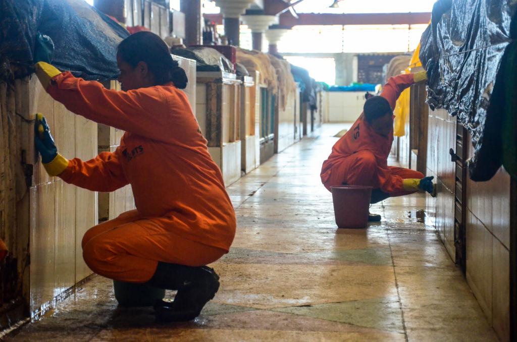No Maria Virgínia, como acontece habitualmente, as equipes da Emsurb realizaram um mutirão para limpeza mais intensa. Os agentes fizeram a varrição e lavagem de todos os setores e a retirada de resíduos das seções de hortifruti, pescados e carnes. Paralelamente, foram executadas a desobstrução das caixas de gordura e vasculhagem do telhado e dos boxes.