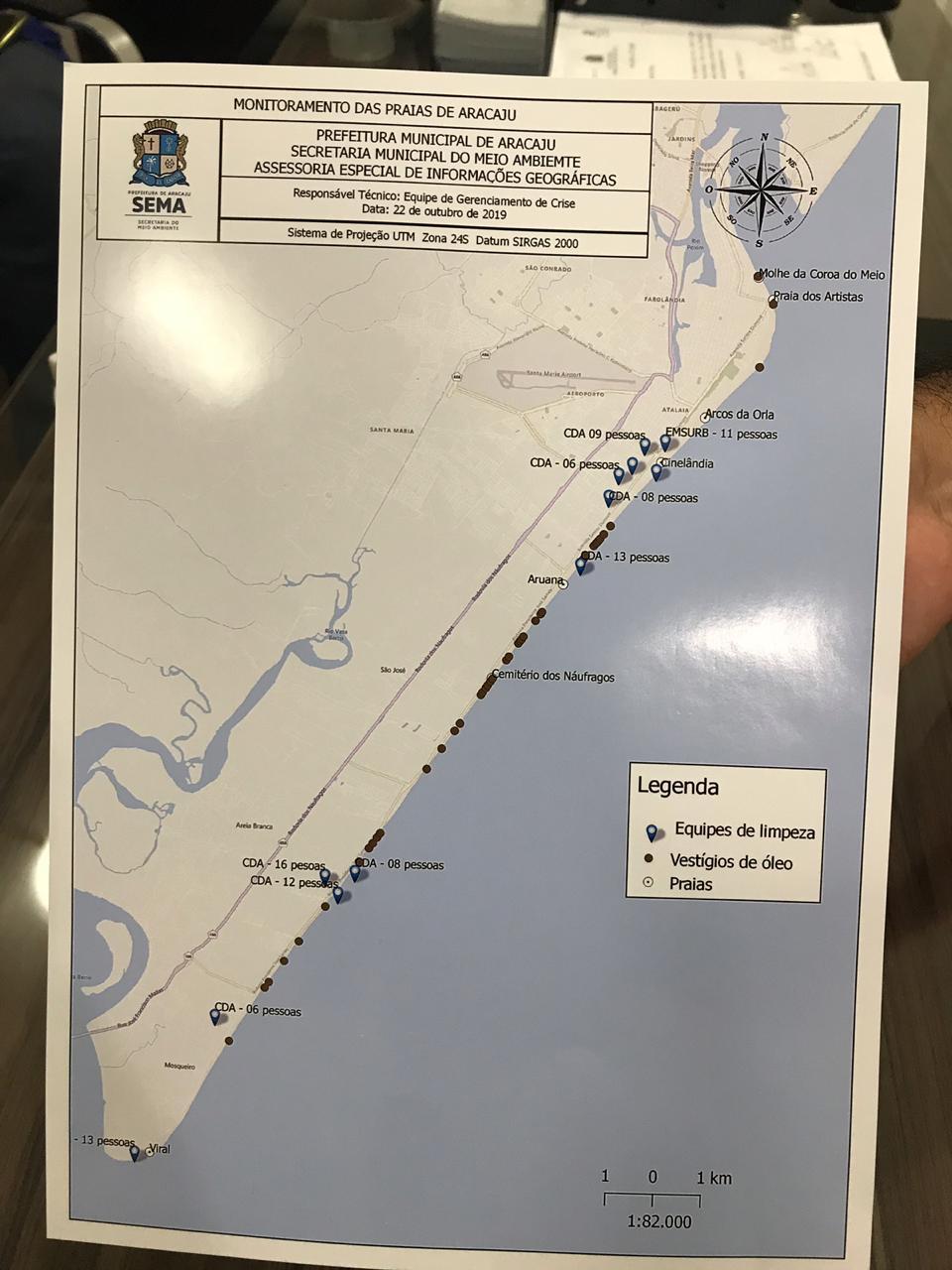 O secretário municipal do Meio Ambiente detalhou os três eixos de atuação executados pela Prefeitura, sendo o primeiro deles o monitoramento. "Sistematicamente temos feito isso, tanto por terra quanto através do drone da Defesa Civil e da Sema, formatando relatórios diários da situação com mapas, para que permitam uma ação mais eficaz de combate ao impacto e limpeza das praias.", ressaltou Alan Lemos ao acrescentar que esse monitoramento tem sido feito diariamente, da foz Rio Sergipe até a foz do Rio Vaza Barris.
